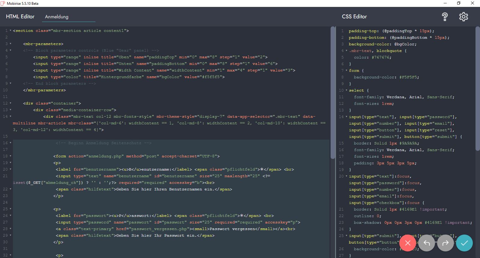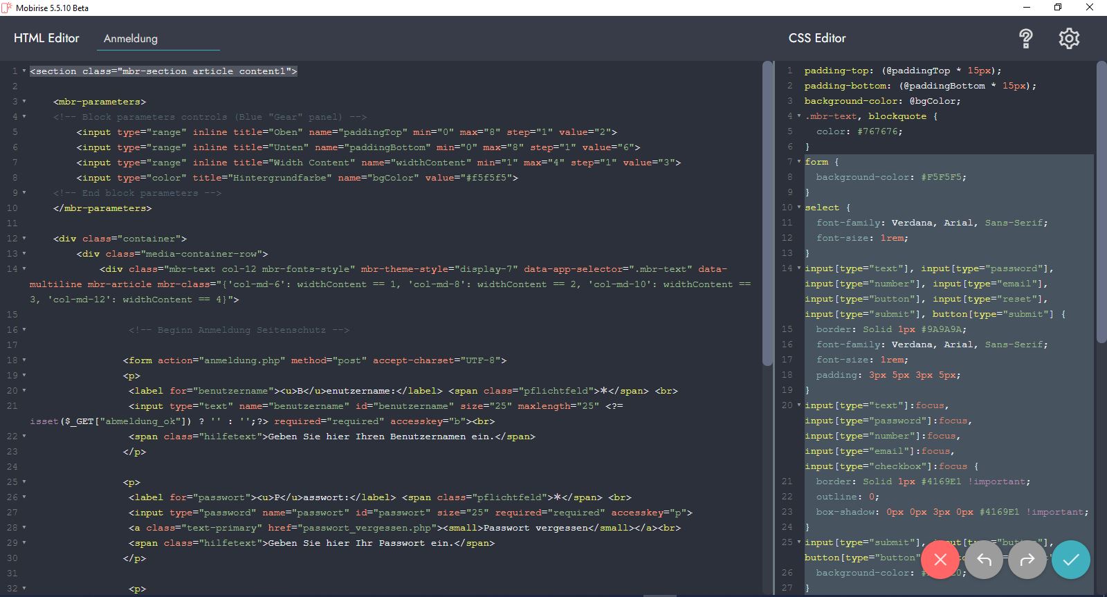 ... und was Du zum anderen genau im "Code Editor" des Mobirise-Blocks einer jeden Seite eingefügt hast: