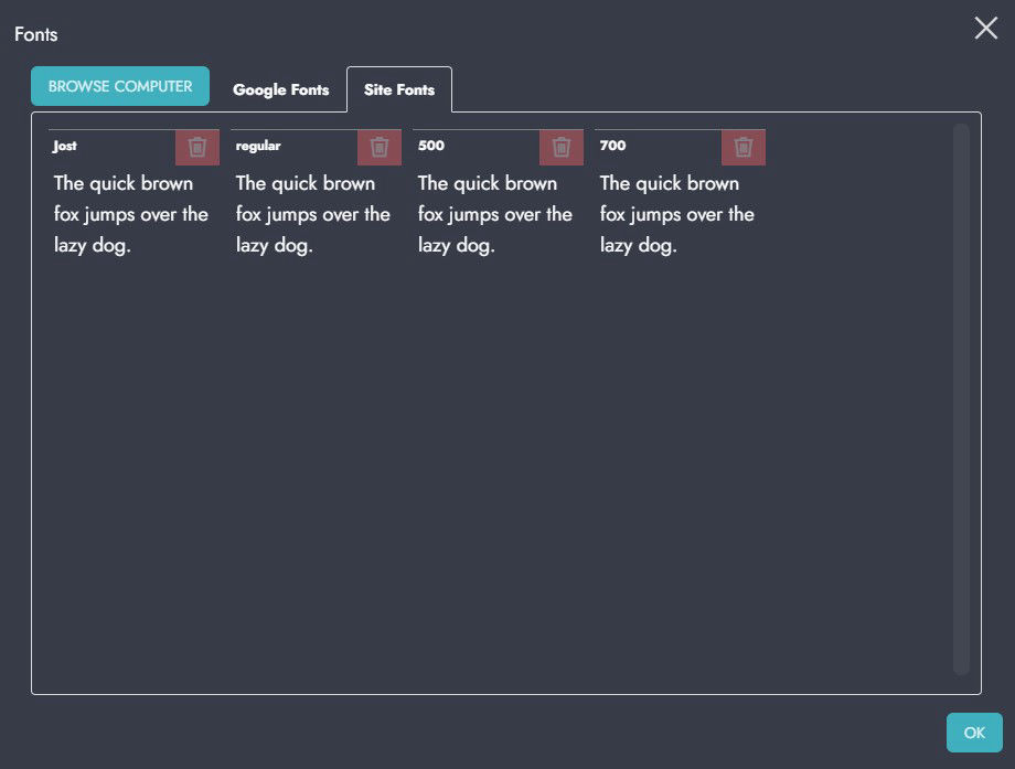 ... alle lokalen "Site Fonts" in meinem Beispiel: