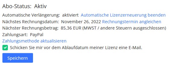 Man erhält dann auch ca. 1 Woche vorher eine Mail als Erinnerung (wenn man das angehakt hat), dass das Abonnement nun erneuert wird.