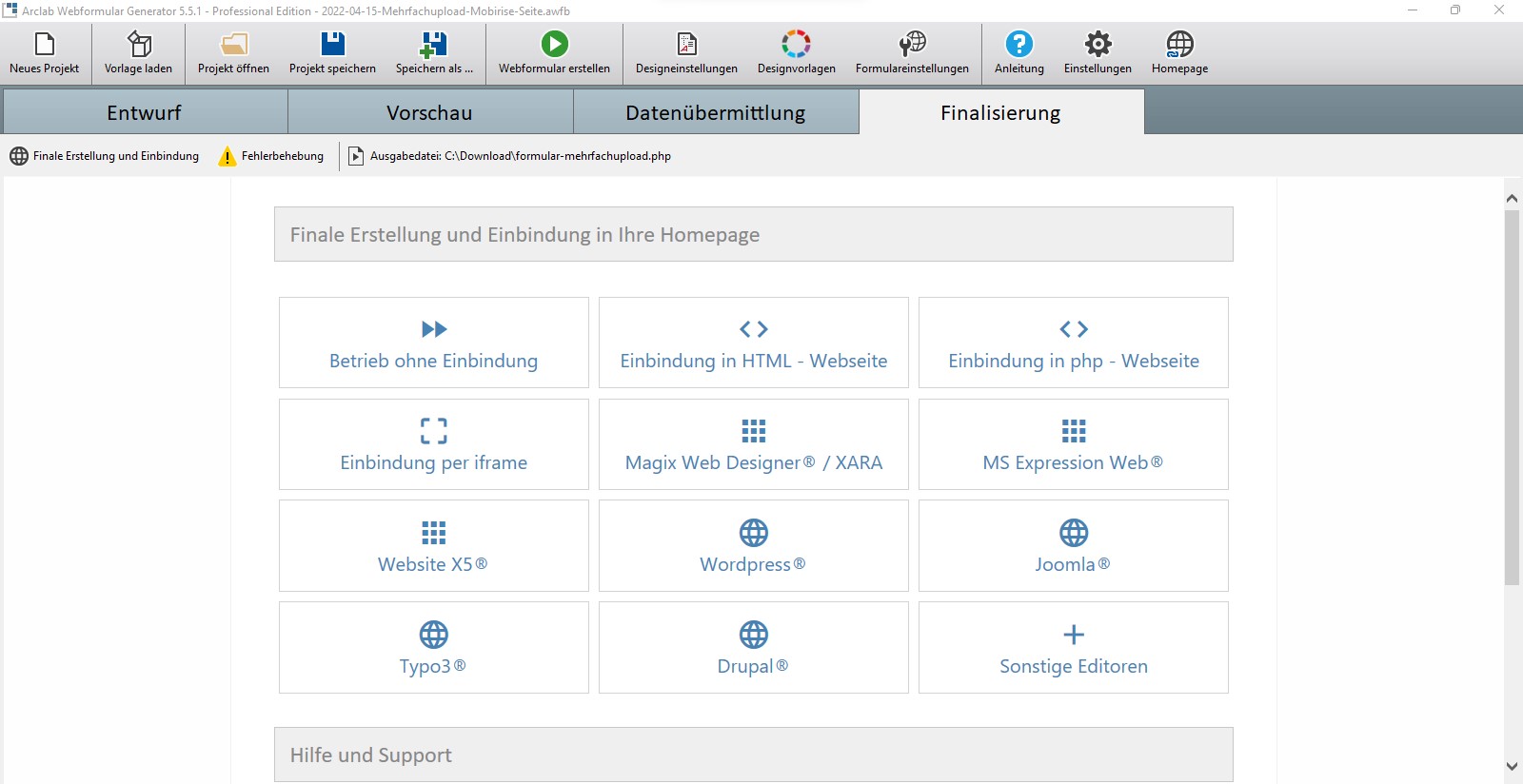 Dieses Programm wird als Anwendung (.exe) am PC installiert und man bindet lediglich eine kleines JavaScript oder auch ein PHP-Include zum Aufruf des fertig generierten Formulars in die Webseite ein.