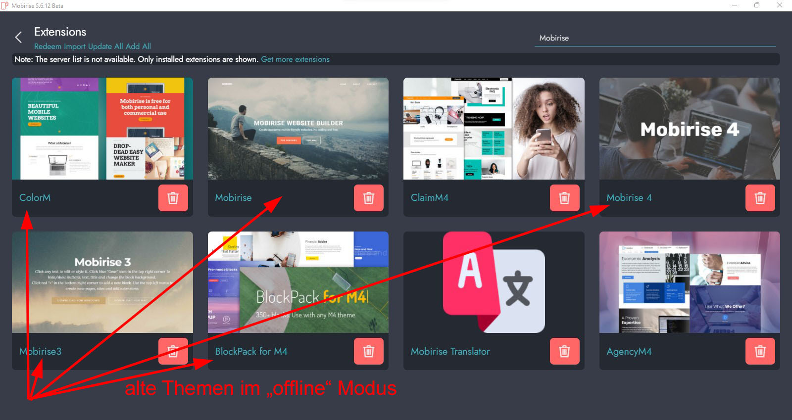 Das Thema "Mobirise4" kannst Du aber nur noch offline wählen (falls installiert). Also "offline" gehen und dann wählen.