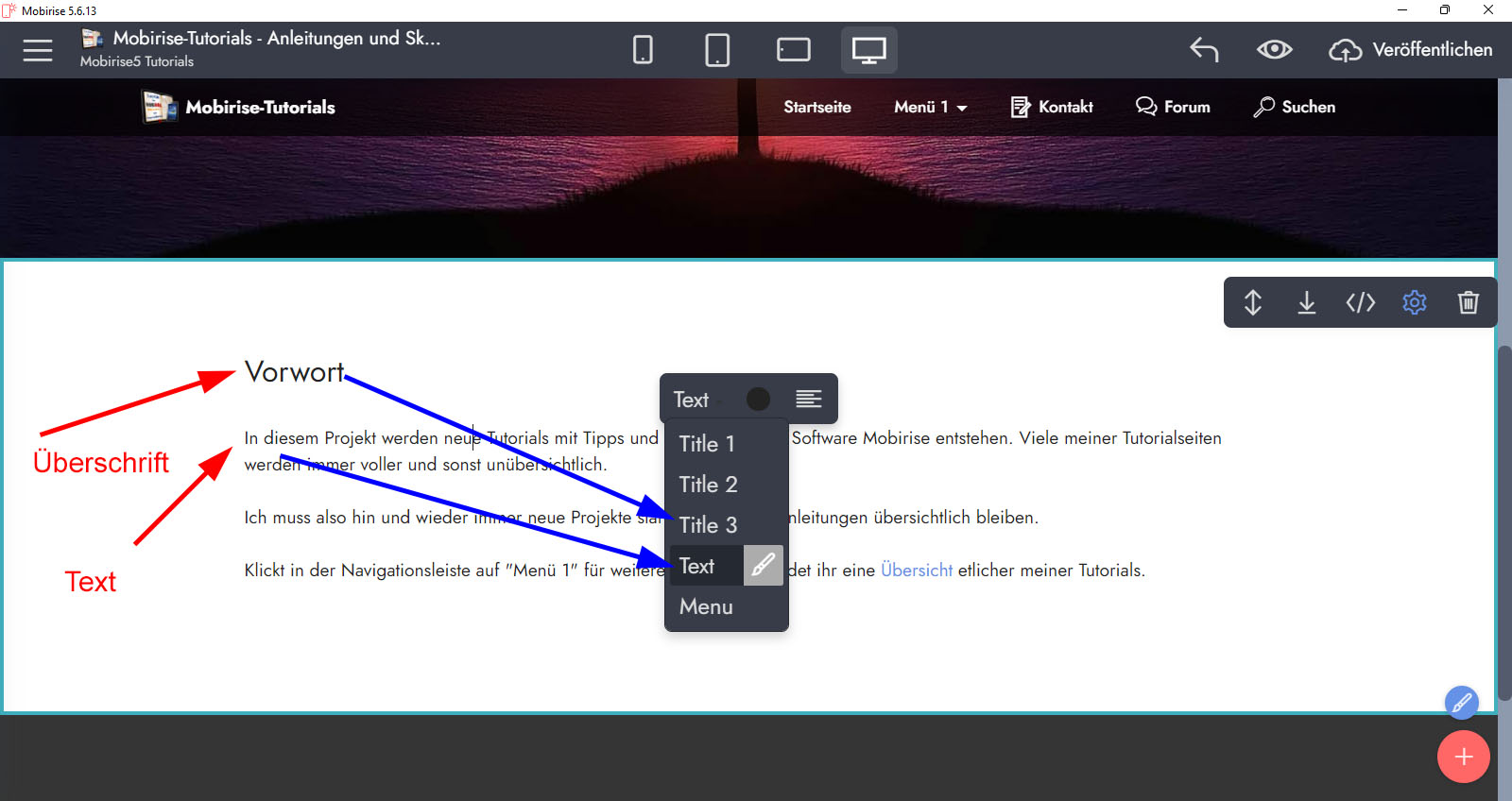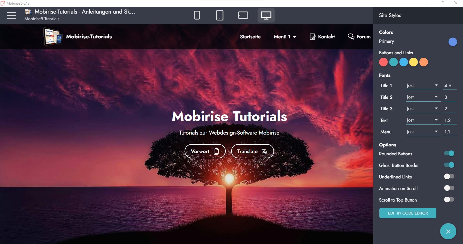 In diesem Screenshot oben verwende ich z.B. das Standard-Thema "Mobirise5" mit der globalen Schrift "Jost".