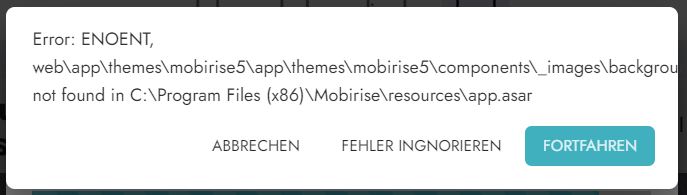 obwohl ich "eigentlich" weder am PC noch an Mobirise geändert habe (ausser eine Seite bearbeitet - ein Block kopiert und wieder eingefügt und geändert), kommt auf einmal eine Fehlermeldung (Error Enoent) - Siehe Anhang.