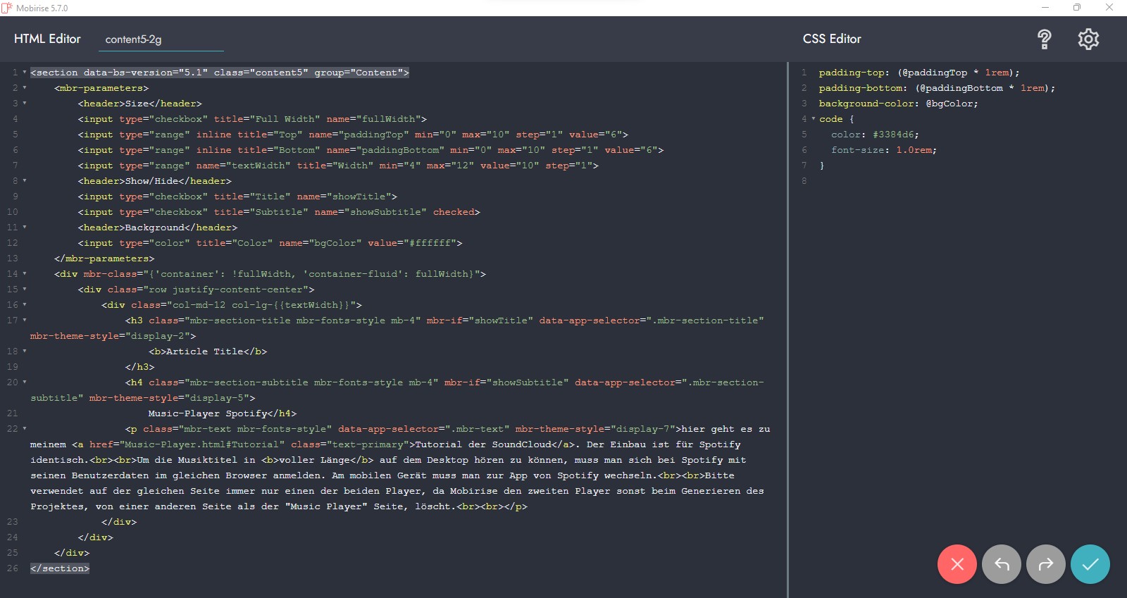 Das Thema "Mobirise4" ist ein freies Thema und hat bereits den neuen "Code Editor", der seit dem Thema "Mobirise4" verwendet werden kann. Der neue "Code Editor" behält die Block-Werkzeuge immer bei, mit denen man die Parameter teilweise umstellen kann.