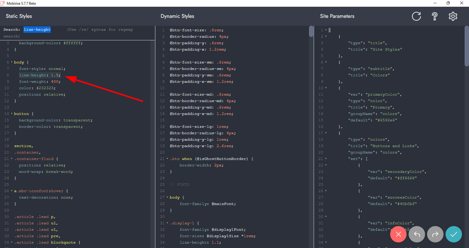 Vielleicht wurde bei Dir diese falsche Linien-Höhe schon aus der v5.5.5 mit der Projekt-Datei auch falsch übernommen. Mobirise ist angehalten solche Style-Anweisungen bei einem Update möglichst gleich zu belassen, sonst müssen die User zu viel ändern.