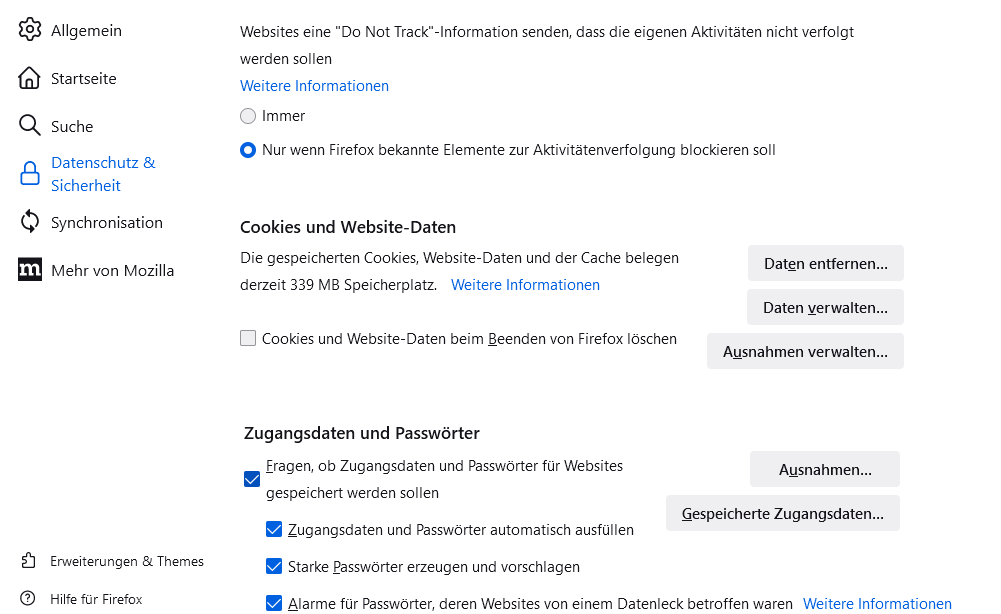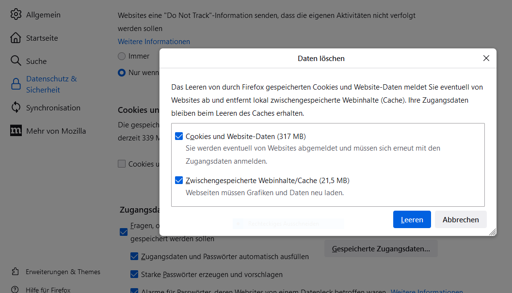Jetzt kann ich auch noch in der Kopfzeile das Schloß anklicken, da erscheint dann "Cookies und Website-Daten löschen"