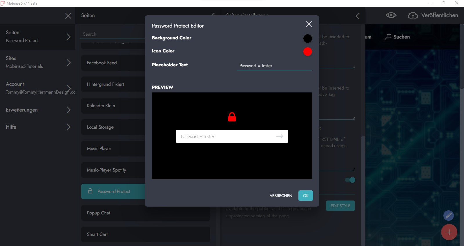 Neue Erweiterung "Password Protect" seit v5.7.11 BETA von Mobirise zum Schutz einzelner Seiten.