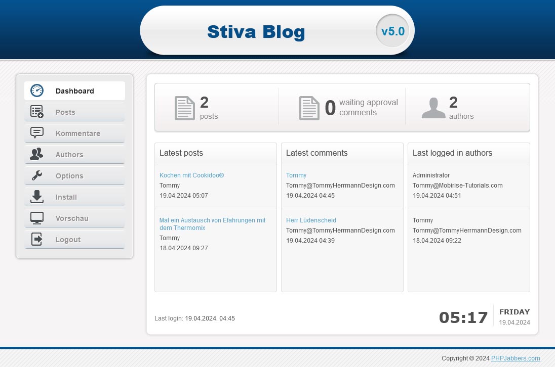 Hier zeige ich das "Stiva Blog 5.0" Script von PHP Jabbers, das ich hier nur als dynamisches Iframe eingebaut habe, da diese Anwendung noch die veraltete Bootstrap Version 3 verwendet und es daher zu CSS Problemen beim direkten Einbau in Mobirise kommt. Die Anpassung der CSS ist wahrscheinlich für die meisten aufwendiger als der Einbau mit der Verwendung von einem Inline-Frame.