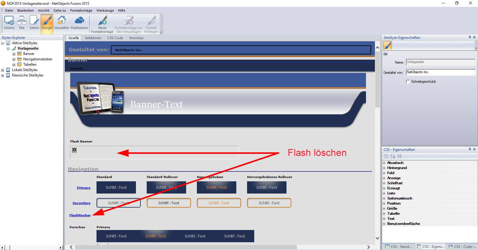 Ihr könnt dieses Problem aber recht einfach lösen, indem Ihr den Flash-Banner und auch die Flash-Navbar aus der Design-Ansicht löscht:
