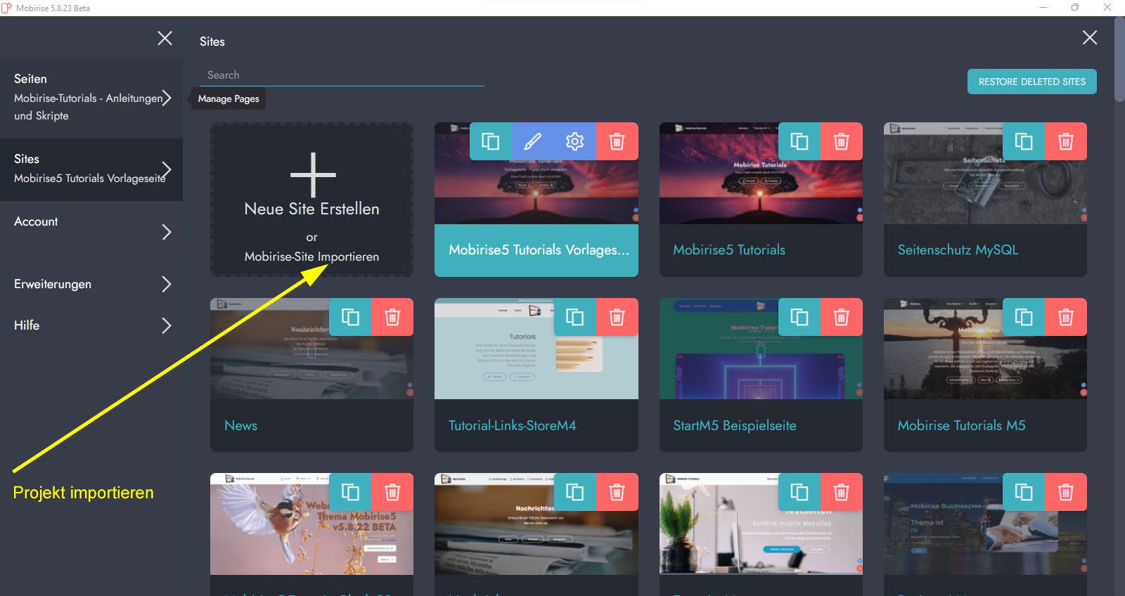 > Menü > Sites > oben links an schwarzer Kachel auf den Link "Mobirise-Site Importieren" klicken
