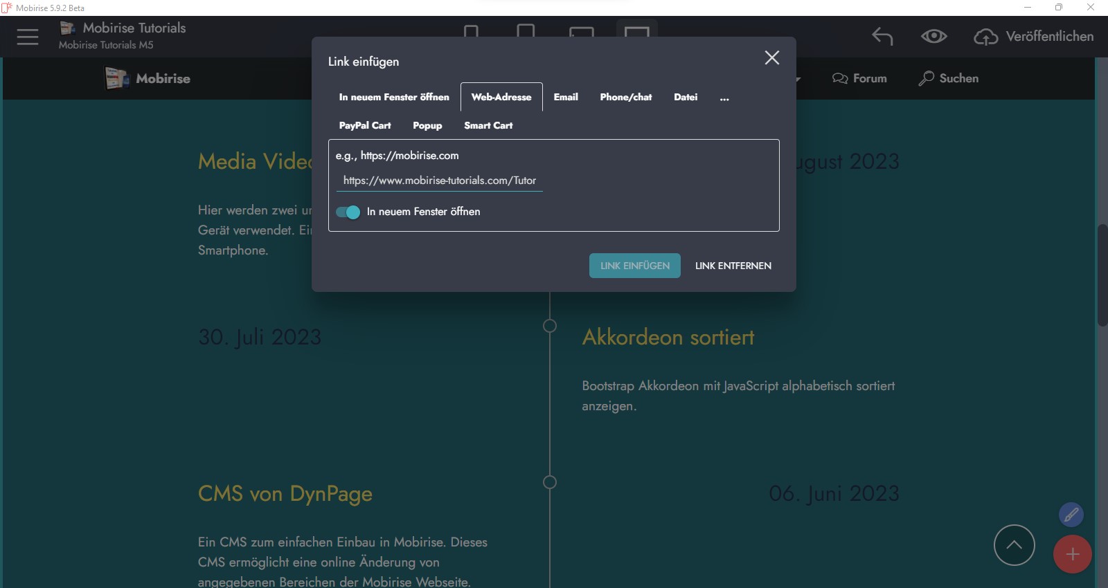 Na einfach die absolute URL im Linkfenster (siehe Screenshot) von Mobirise angeben - also das Protokoll "https://" mit dem "Domain-Namen" und dem "Verzeichnis-Namen" vom neuen Projekt.