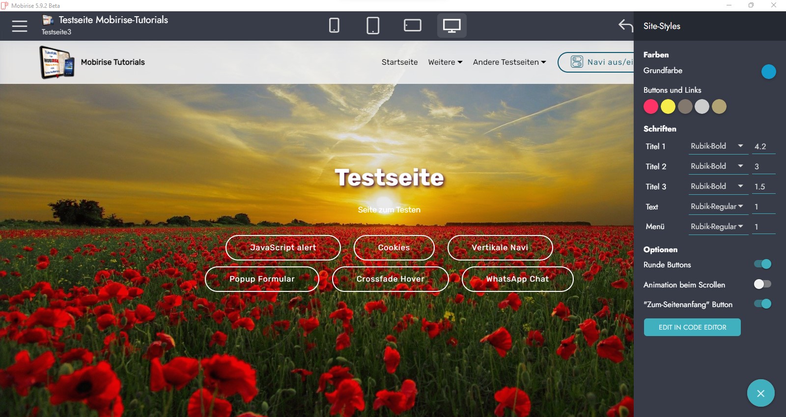 Natürlich muss die neu gewählte Schrift auch bereits über die CSS-Datei Deines Mobirise-Projektes vom Browser geladen worden sein. Sicherlich ist es dann der einfachste Weg eben den Schrifttyp zu wählen, den Dein Projekt bereits verwendet (wie bei mir eben "Rubik").