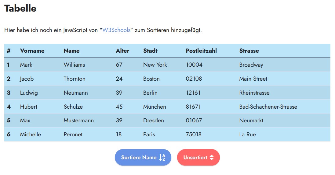 Mit einem JavaScript in reinem "Vanilla JavaScript" ist diese Tabelle auch sortierbar.
