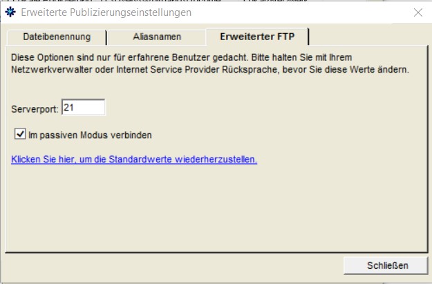 Dabei ist zu beachten, dass man bei den "Erweiterten Publizierungseinstellungen" die Serverportangabe nicht vergißt.