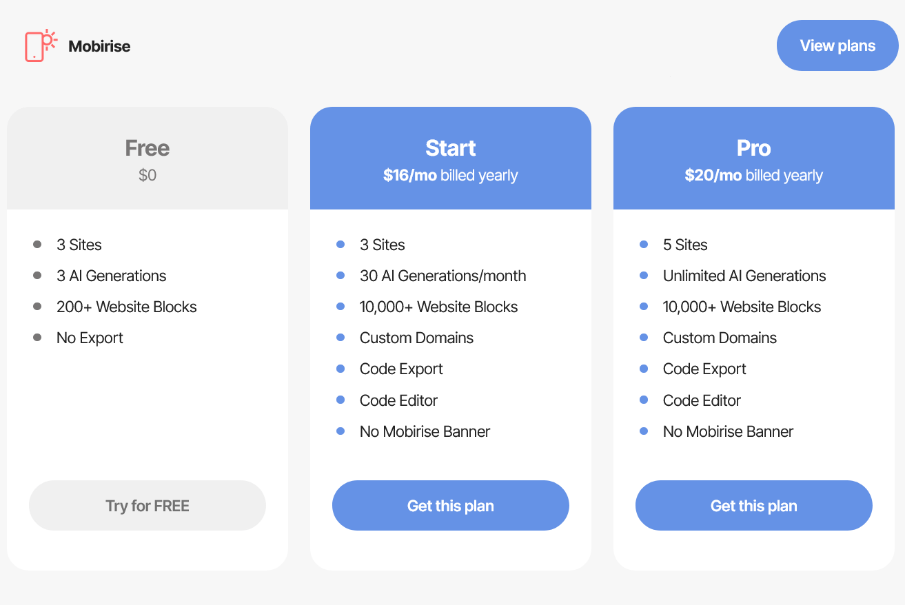 Mit der Veröffentlichung der Mobirise-Version 5.9.20 BETA am 25. Juli 2024 wird ein Preisplan für "Mobirise AI" eingeführt, den ich persönlich als wenig attraktiv empfinde. Dies gilt insbesondere, solange das Tool lediglich eine einzige Startseite (index) generieren kann, die zudem unvollständig ist und erheblichen Nachbearbeitungsaufwand erfordert. Die Generierung ist auf 3 beziehungsweise 5 Seiten limitiert, und dies gilt nur für die Seiten, die über "Mobirise Online" auf den Servern von Mobirise gehostet werden: