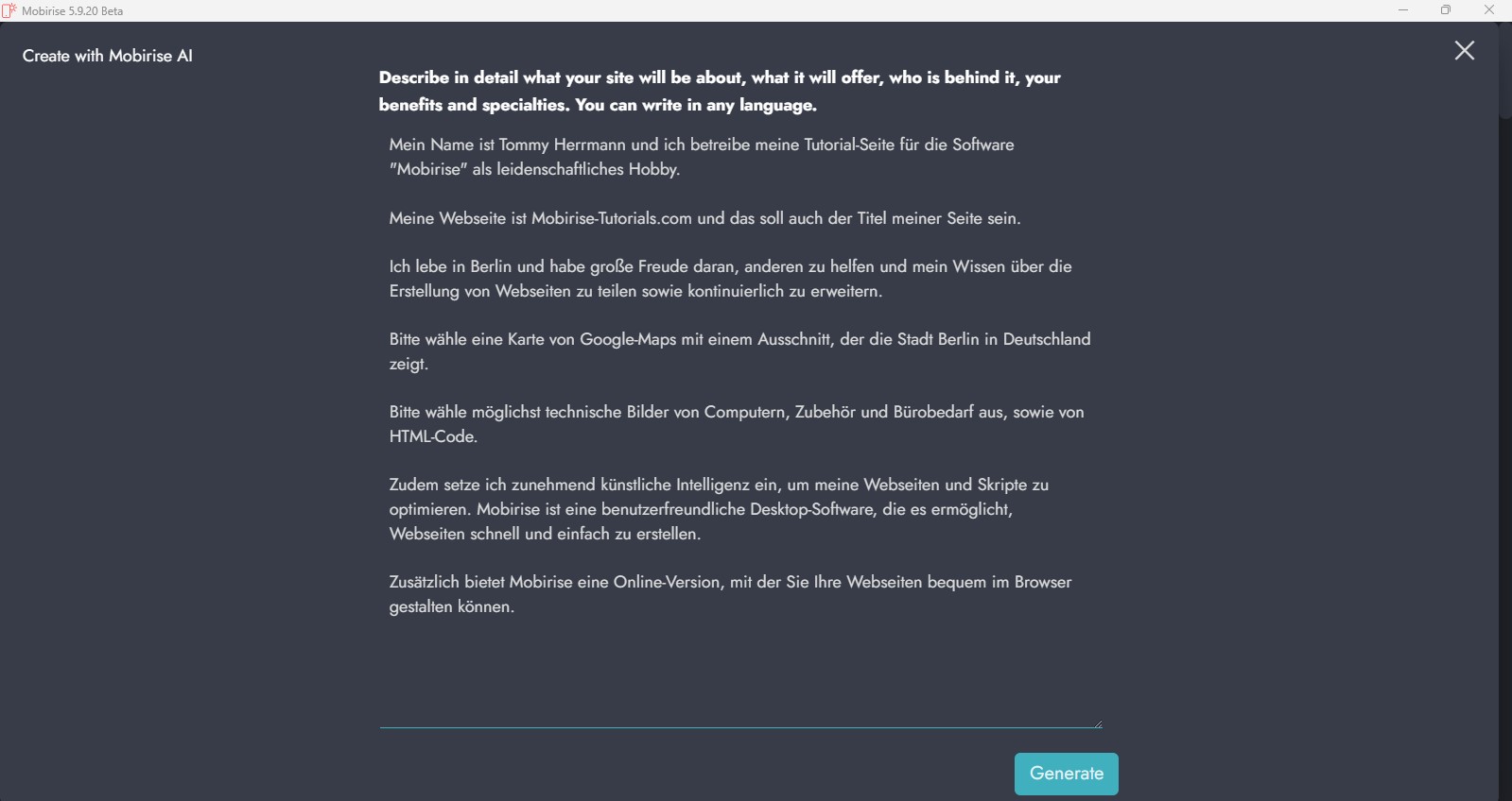 Diesen Text habe ich beim Mobirise AI Generator als einzige Info für die KI eingegeben und damit wurde meine Seite, so wie sie sich jetzt darstellt, in wenigen Sekunden generiert (kaum zu glauben):