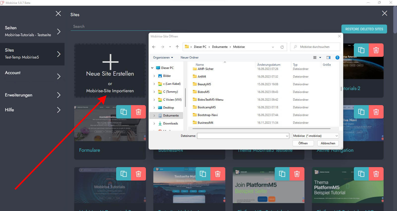 > Menü > Sites > oben an schwarzer Kachel auf den Link "Mobirise-Site importieren" klicken