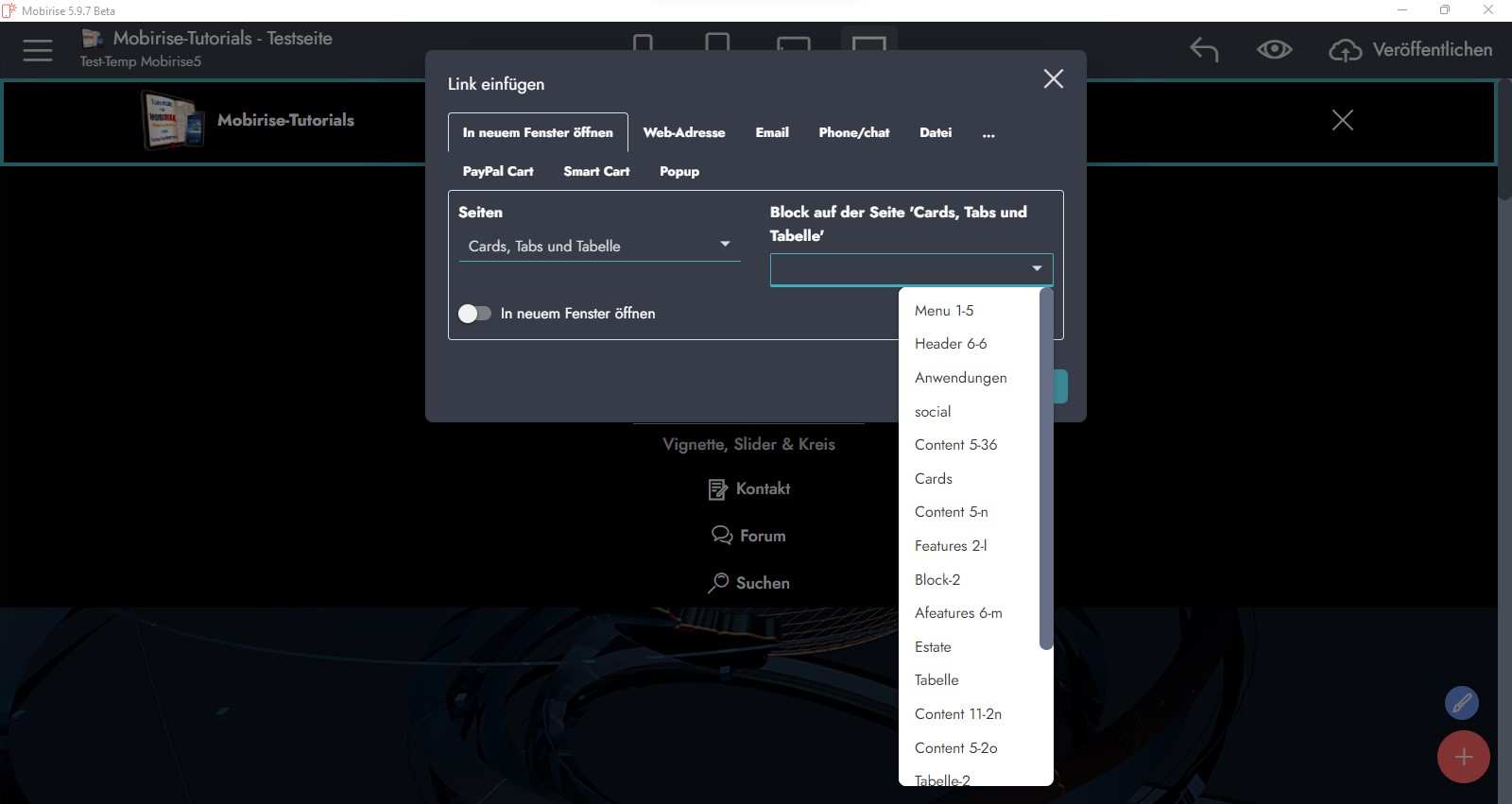 Man wählt im Linkfenster von Mobirise links die Seite und rechts im Dropdown dann einen "Anker".