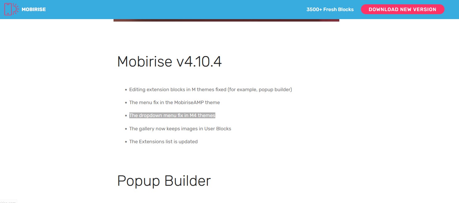 Ich habe mir jetzt mal die Mühe gemacht und bei Mobirise auf der alten Update-Seite von Version 4 gesucht und dort wurde zum Beispiel mit v4.10.4 vom 17.06.2019 ein Problem mit dem Dropdown-Menü behoben (siehe Screenshot):