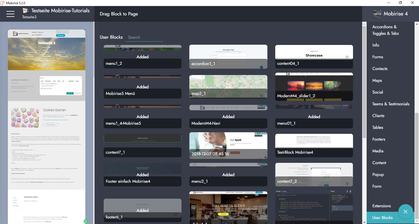 Ich kann Benutzer-Blöcke, die ich bereits mit der Software-Version "Mobirise 4" gespeichert hatte, ebenso in Software-Version "Mobirise 5" weiter verwenden.