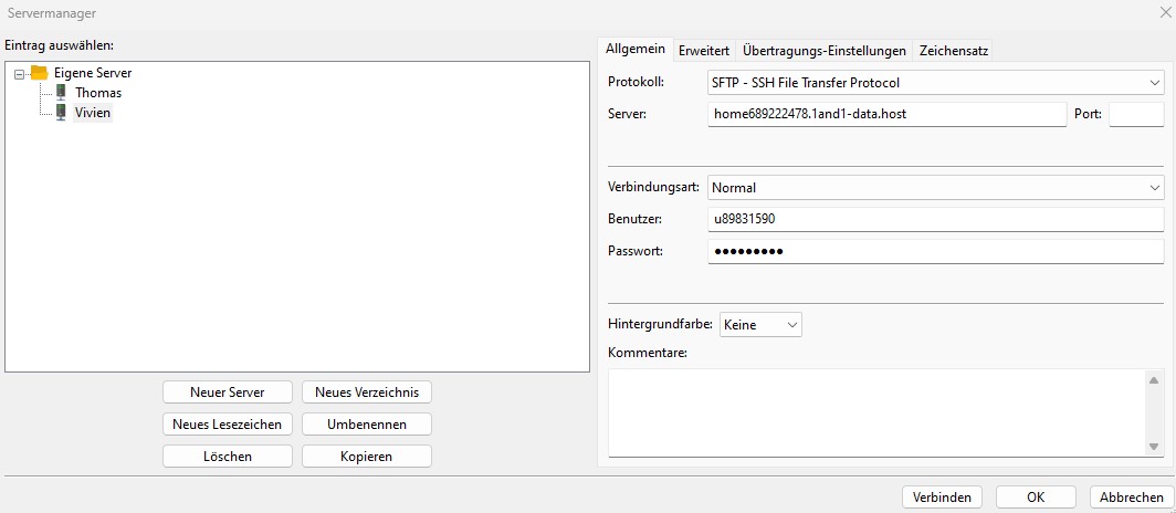 Die Daten im Screeenshot sind in Ordnung. Schauen Sie bitte einmal unter dem Button "Erweitert" und setzen dort den Port auf 22. Prüfen Sie dann bitte, ob die Verbindung funktioniert."