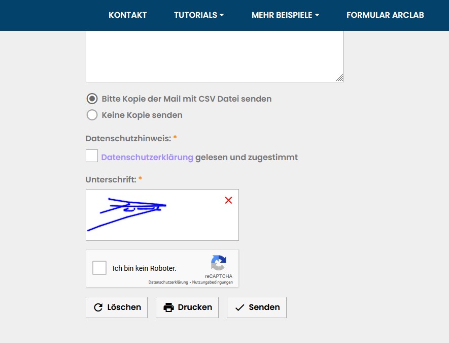In meinem Beispiel unten, eines "Arclab" Formulars, kann man unterschreiben und alle Daten werden auch noch als CSV-Datei mit an die Mail gehängt, die man gleichzeitig auch als Kopie an den Benutzer senden kann: