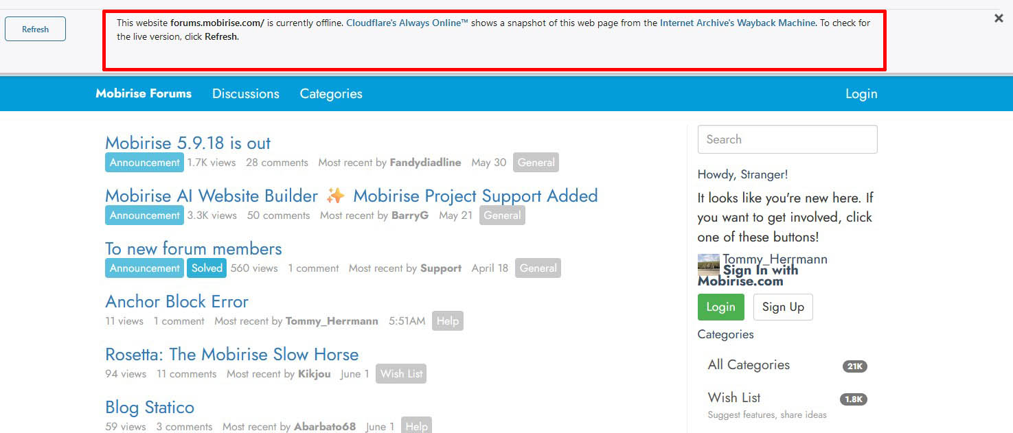 Seit gestern habe ich teilweise große Probleme, das Hersteller-Forum überhaupt aufzurufen. Könnte natürlich auch einfach eine normale Server-Störung beim Provider von Mobirise sein.