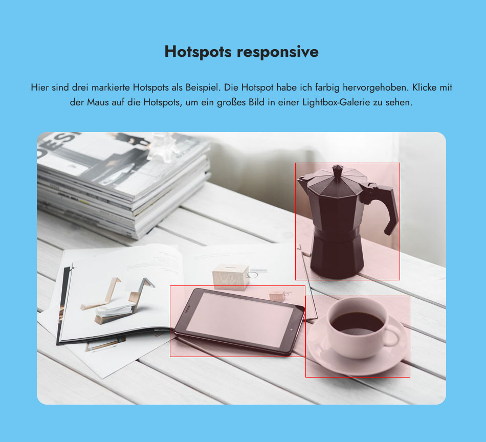 Mit dieser erweiterten Version hast du nun vier Hotspots, die korrekt positioniert und skaliert werden, wenn das Bild auf verschiedenen Bildschirmgrößen angezeigt wird.