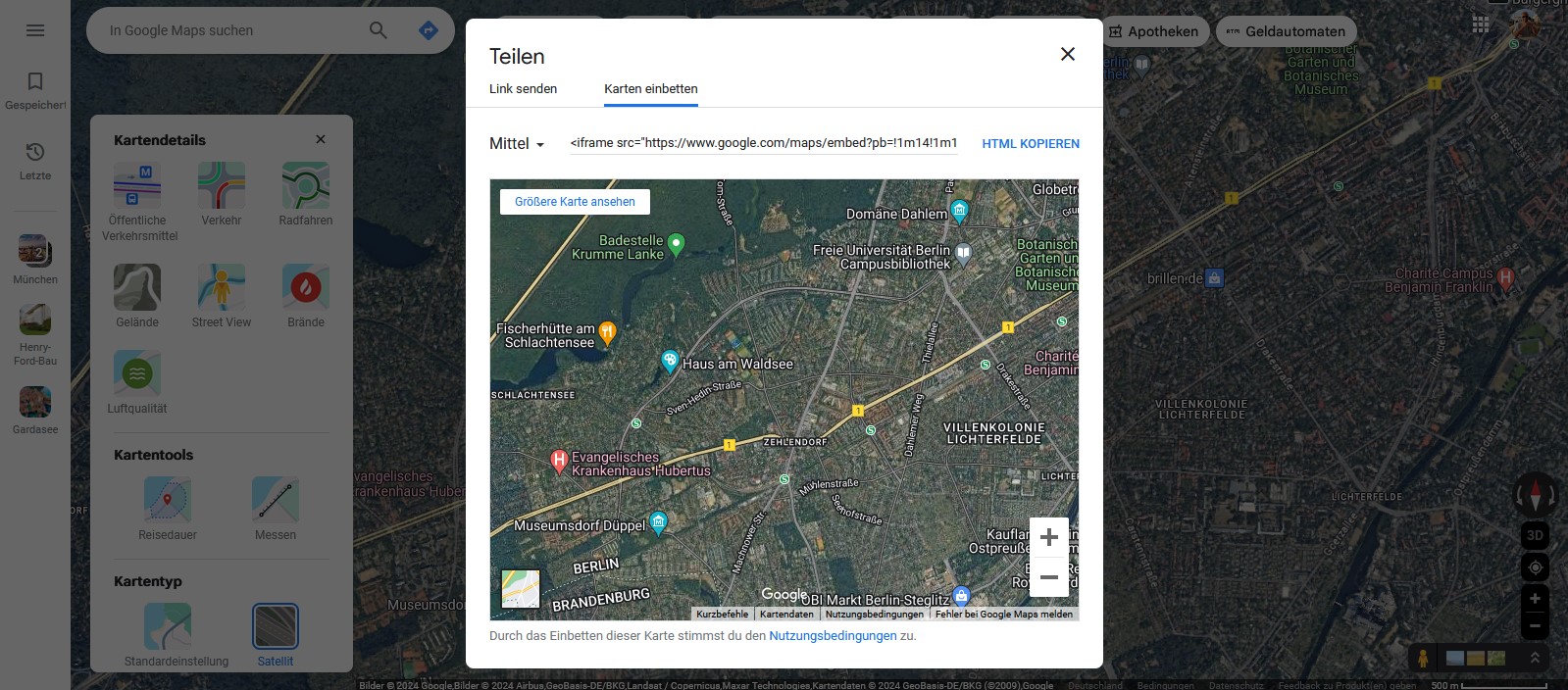 Du rufst bei Google Maps, in der Satellitenansicht, deinen Kartenbereich auf und kopierst dann den <iframe> Code zum Einbetten: