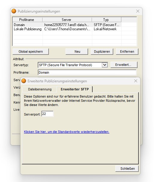 ... also, ich kann nach wie vor auf meinen "IONOS" Server mittels NOF publizieren. Bist Du sicher, dass das Passwort korrekt ist und auch der Port: 22 (am Button "Erweitert") verwendet wird?