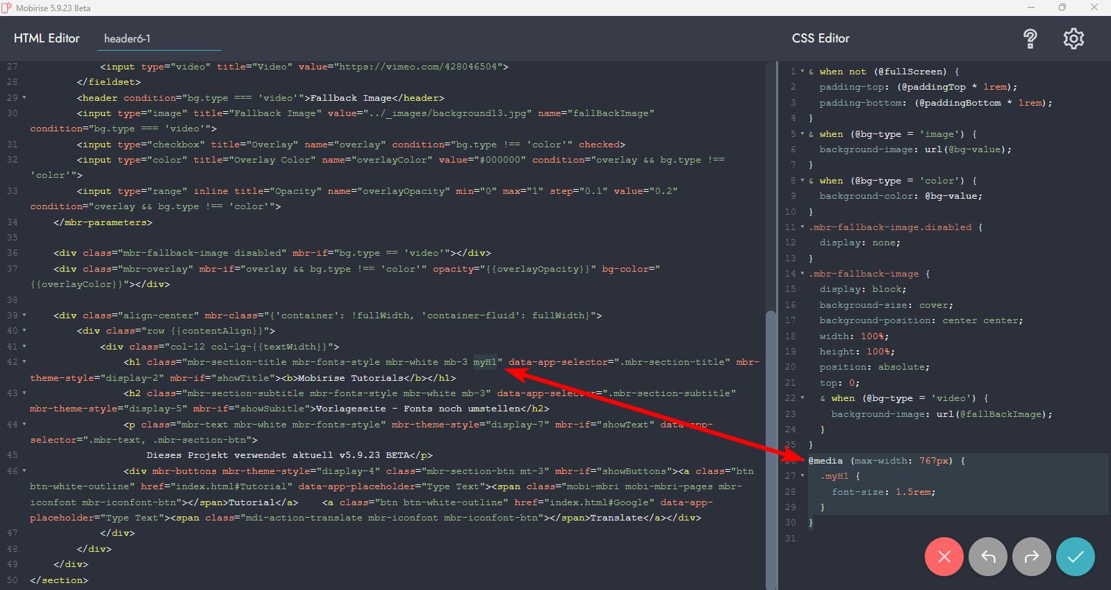 Kopiere also diese CSS-Anweisung in den Bereich "CSS Editor" von Deinem Header-Block und schreibe diese class="myH1" mit an die bereits vorhandene Class vom <h1> Tag im "HTML Editor" hinzu. Siehe Screenshot: