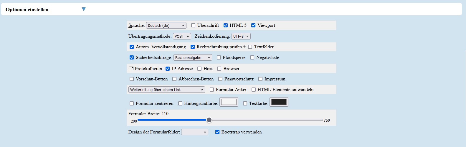 Gucke Dir auch im Screenshot (unten) mal die von mir verwendeten Optionen an, also was ich da so angehakt habe. Das kann wichtig sein, wie z.B. die Verwendung von "HTML5" und "Bootstrap", damit das nachher auch am Handy gut angezeigt wird. Im Moment ist Dein Formular am Handy nämlich zu breit.