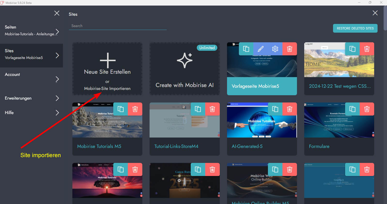 Importiere diese Projekt-Datei "project.mobirise" dann aus diesem neuen Verzeichnis in dieses neue Verzeichnis über die Software: