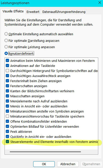 Kurz nachgedacht. Gestern habe ich in Windows11 in den Leistungsoptionen ein paar Optionen geändert ...