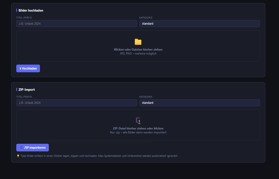 PPS: Man kann auch ein Zip File hoch laden und es direkt auf dem Server entpacken lassen. Server entpackt es und importiert alle Bilder automatisch in die DB.