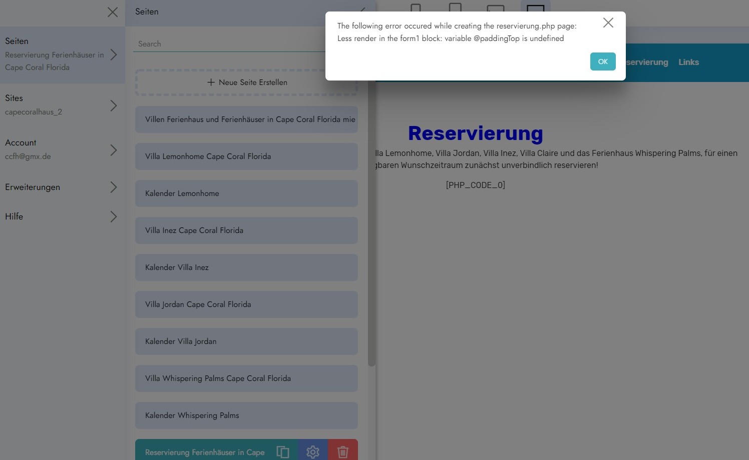 Jetzt geht es nur noch um diesen Fehler: "The following error occured while creating the reservierung .php page: Less render in the form 1 block: variable @paddingTop is undefined"
