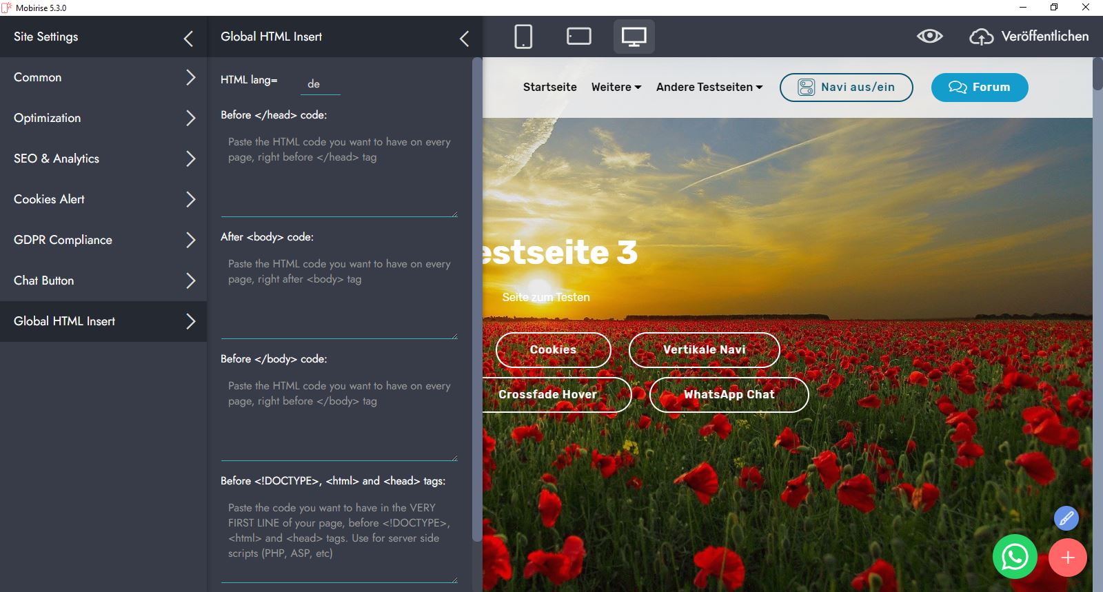 ... also diese globalen (seitenübergreifenden) Einstellungen nimmt man hier vor, wenn man den "Code Editor" käuflich erworben hat. Diese globalen Einstellungen stehen erst seit Mobirise Version 5.0 zur Verfügung: