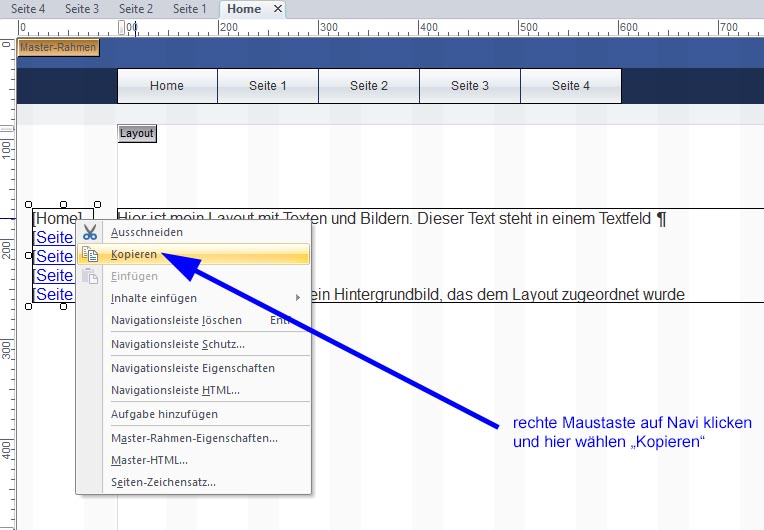 Du klickst also in NOF auf der Arbeitsseite "tv-plattform" mit der rechten Maustaste auf Deine vertikale Navi um diese zu markieren und wählst im sich nun öffnenden Kontextmenü dann "Kopieren" (siehe Screnshot). Klicke also dann mit der linken Maustaste auf "Kopieren":