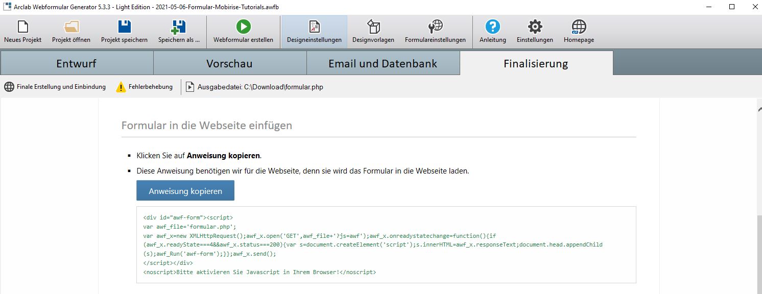 Ich habe jetzt eine Beispielseite mit Tutorial zu dem "Webformular Generator" von "Arclab" erstellt: