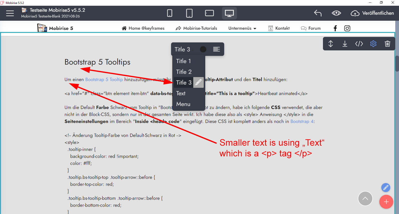 Tool to change font sizes in Mobirise. If you click on the brush symbol within the selected font size, you can also adjust the font size globally (for the entire project) to your liking: