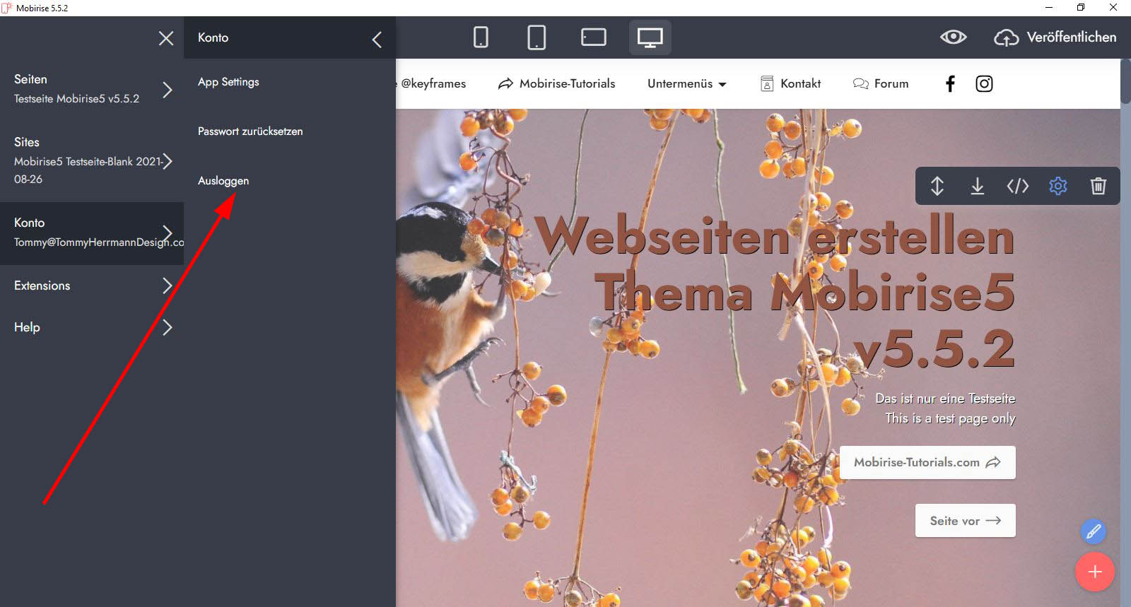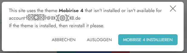 Aber Mobirise logt sich automatisch mit meiner falschen EMail-Adresse ein.