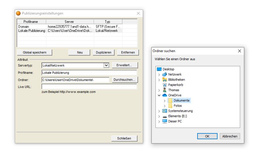 Temporär kannst Du es ja mal versuchen - also z.B. für die lokale Publizierung eben das Verzeichnis von "OneDrive" zu wählen. So sieht das normalerweise bei NOF aus: