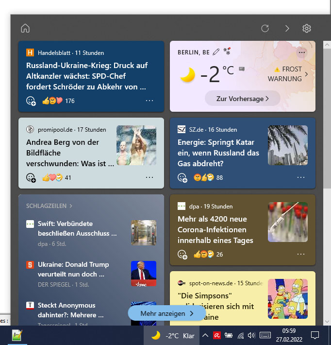 Seit gestern habe ich, warum auch immer, Probleme mit dem Microsoft-Feeds unten in der Taskleiste, in dem die wichtigsten Informationen angesehen und aufgerufen werden können.