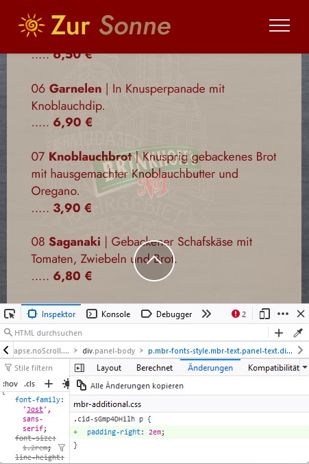 Dazu trägst Du die CSS-Anweisung "padding-right" in den Bereich "CSS Editor" des Blocks mit der Speisekarte ein (ganz unten ran schreiben genügt, Mobirise schiebt es dann an das bereits vorhandene p Element):