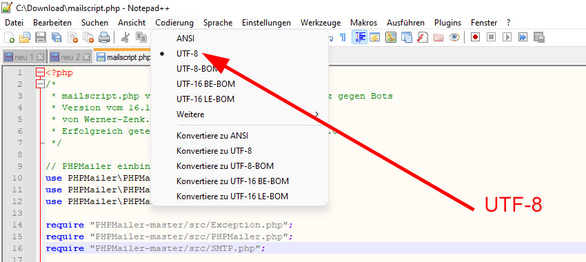 $mail->addAddress("mail@dao-thaiwellness.de", "Dao Lukas"); // EmpfängerAchte auch zwingend darauf, dass das Skript vom Werner, das Du ja anpasst, seine Kodierung von UTF8 beibehält. Also auf keinen Fall mit einem Text-Editor ändern, sondern mit dem "Windows-Editor" oder auch "Notepad++"