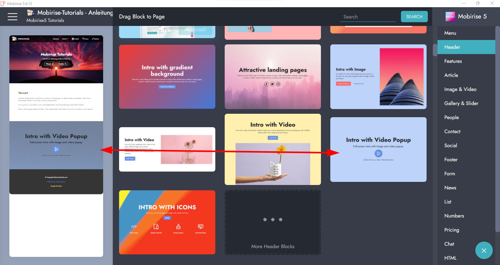 Das Standard-Thema "Mobirise5" hat z.B. einen Header-Block mit Hintergrund-Video und einem zusätzlichen Video in der Lightbox. Da musst Du mal etwas suchen ...