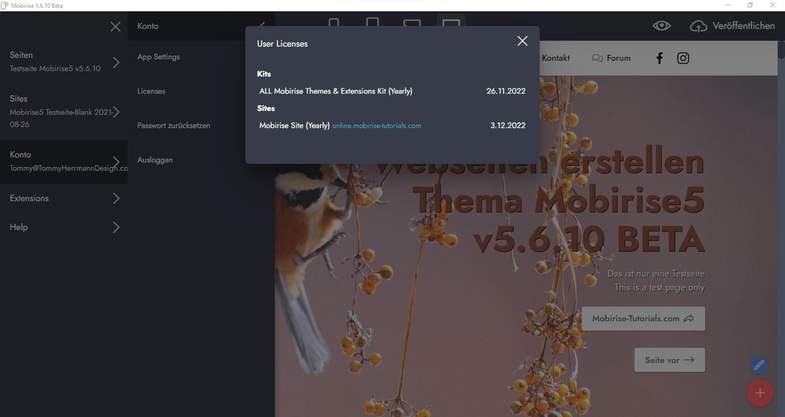 * Mobirise gehostete Sites: Der Link wird unter "Konto" (Account) auch in der Lizenzliste mit Ablaufdatum angezeigt