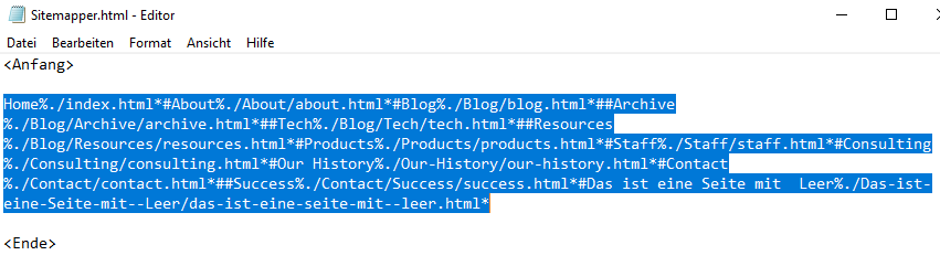 Der generiert (wenn er denn läuft) beim (lokalen) Publizieren eine Datei "Sitemapper.html", die ich dann mit meiner Exceltabelle auswerte und in HTML-Code umbaue.