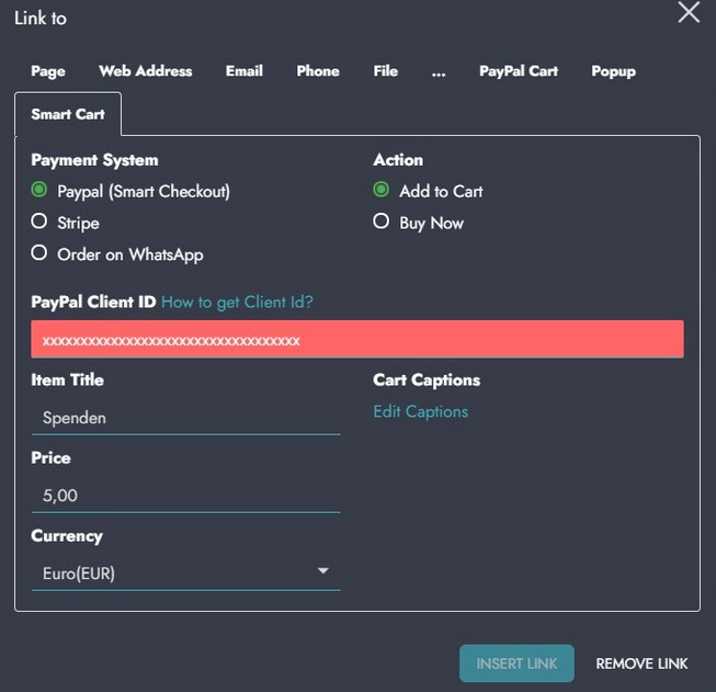 Die Erweiterung "Smart Cart" findest Du auch, nach der Installation, nicht bei den Blöcken sondern als zusätzliches Tab "Smart Cart" im Mobirise Link-Fenster: