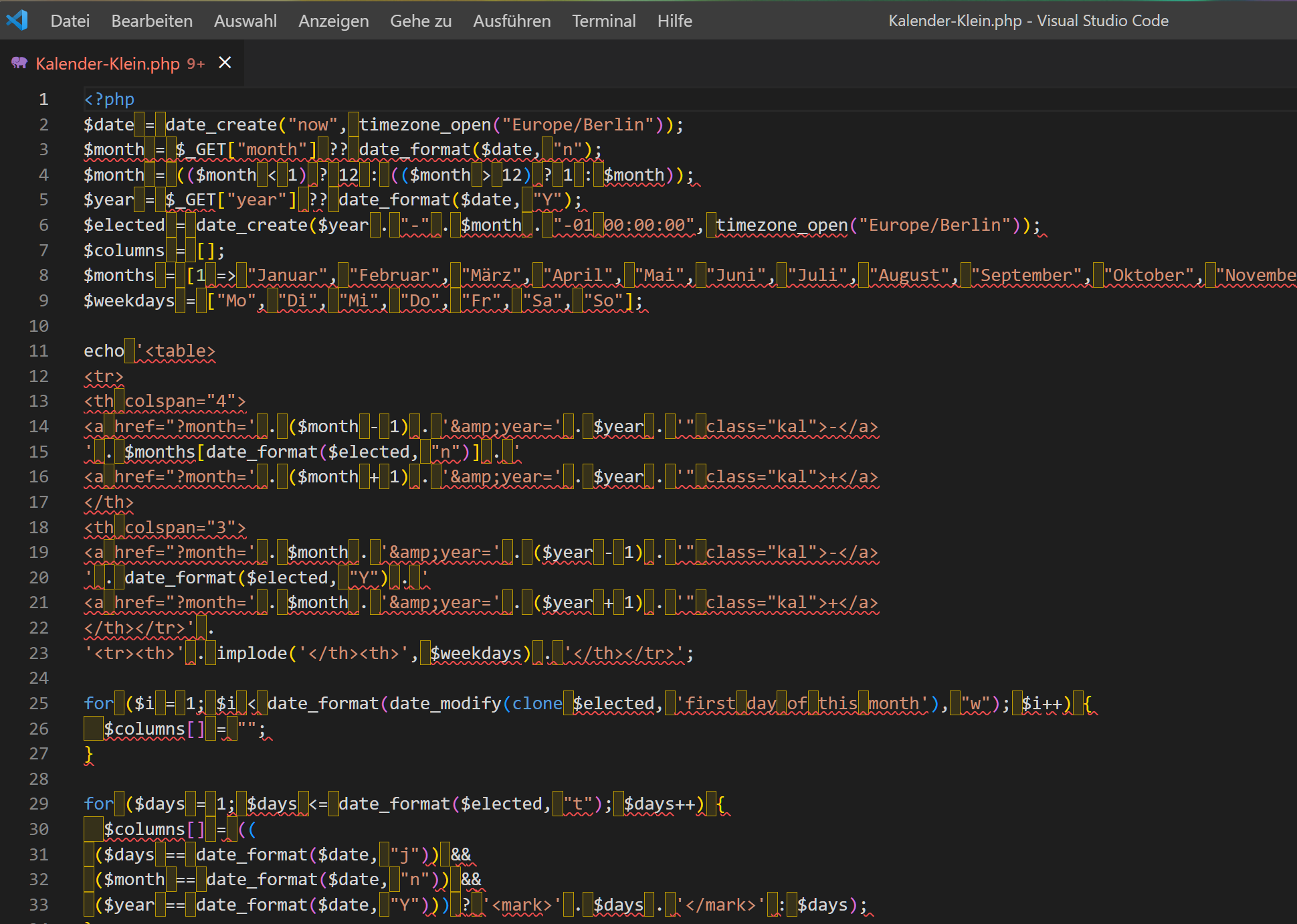 Visual-Studio Code zeigt die fehlerhaften Leerzeichen direkt an: